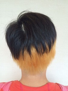 右前額髪際部~左耳後部までブリーチ、黒とのコントラストを表現!ブリーチの箇所には近々ディレクションカラーを予定しております。